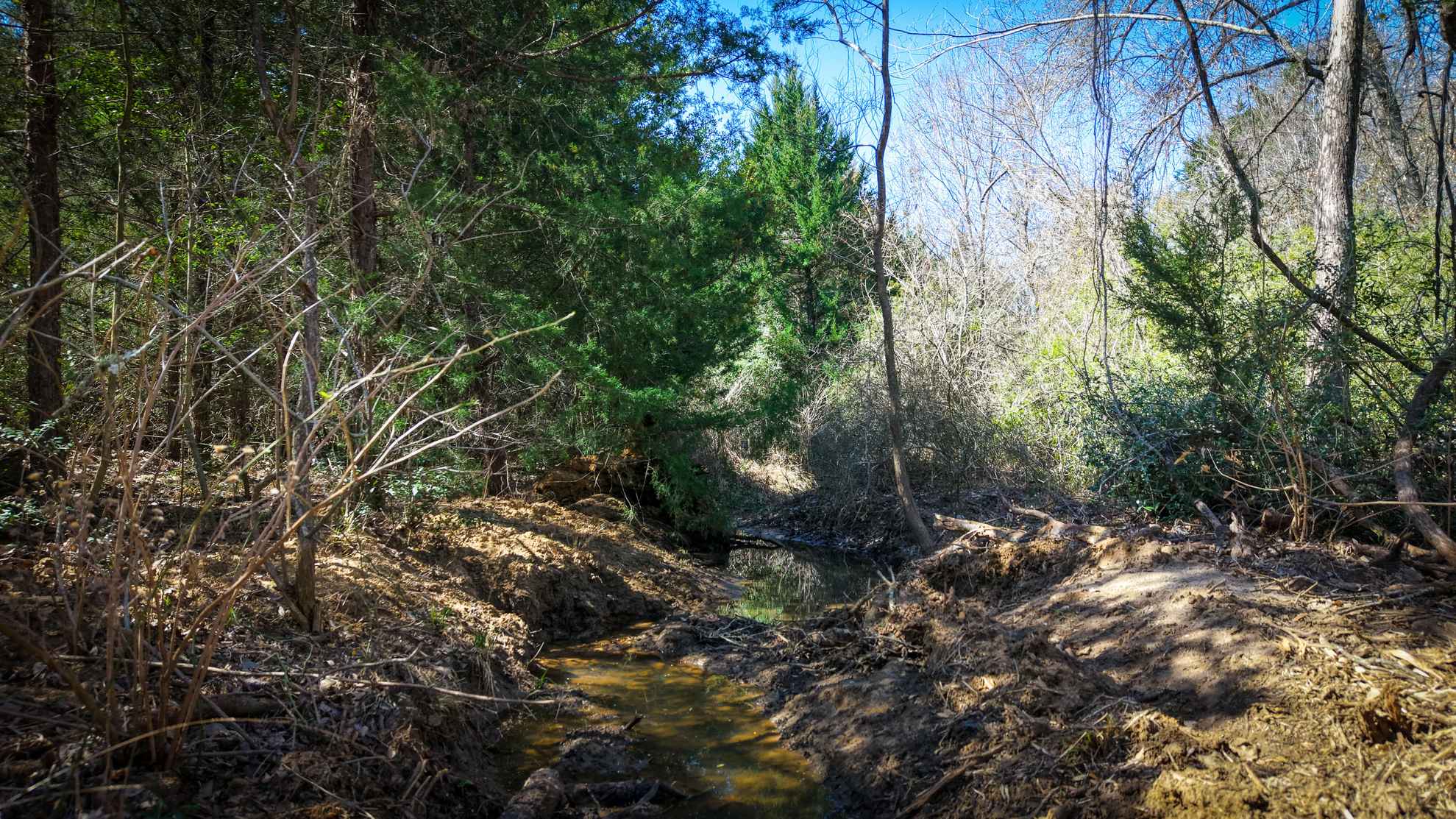 The ranch features rolling hills, creeks, and open pastures that provide both scenic views and practical use. The property has over 70 feet of elevation change, ranging from approximately 450 to 520 above sea level, and includes one existing stock tank. Wooded creek bottoms are lined with mature hardwoods, and several open areas offer ideal spots for pasture, grazing, or future food plots. A spring-fed creek runs through the property, providing the potential for a pond or lake site to enhance livestock, wildlife, or recreational opportunities.